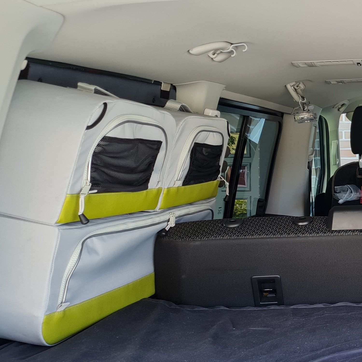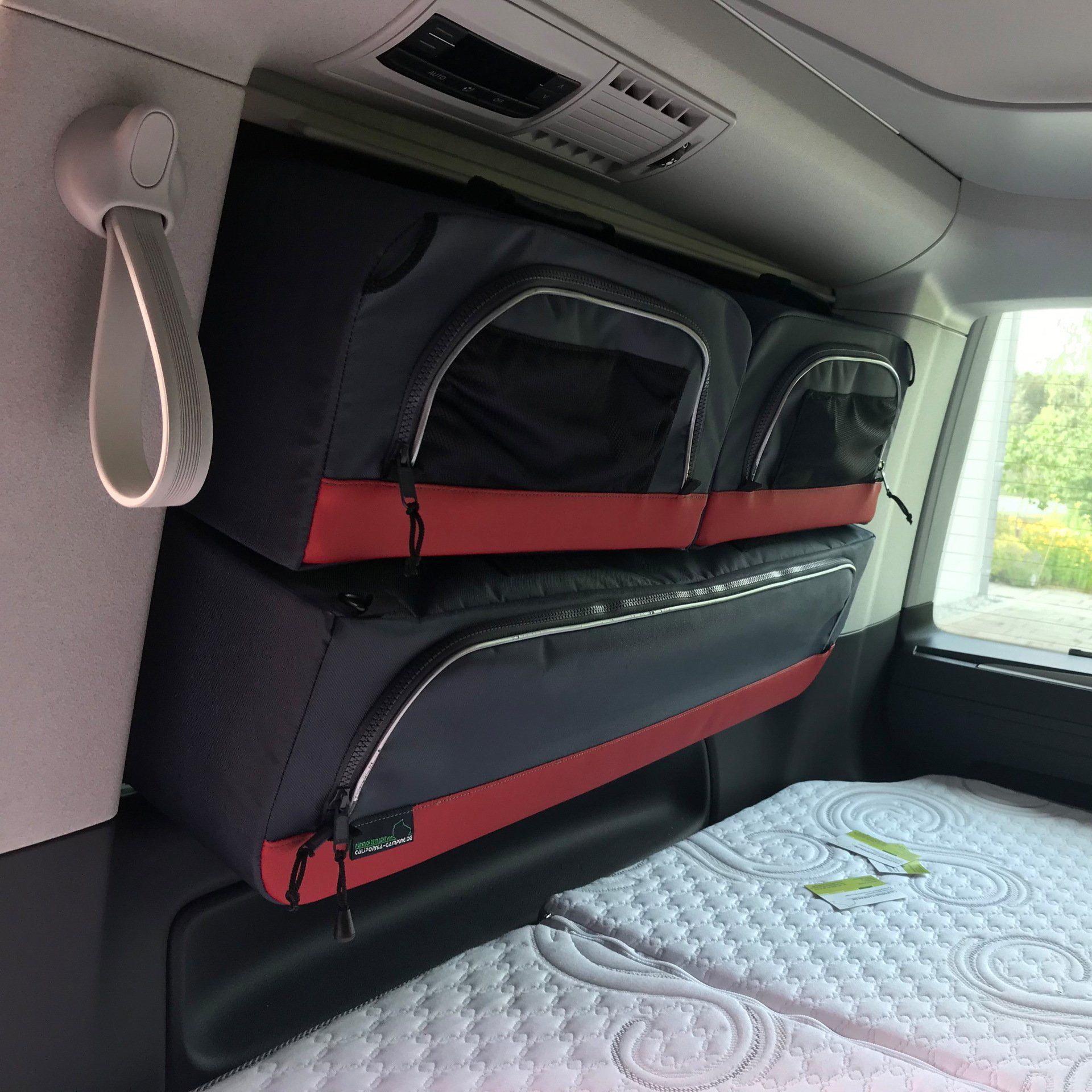Die zwei Fenstertaschen sind heute angekommen. Sie gefallen uns sehr gut, wir sind ganz begeistert. Sie bringen etwas Farbe in unseren einfarbig grauen Bus.